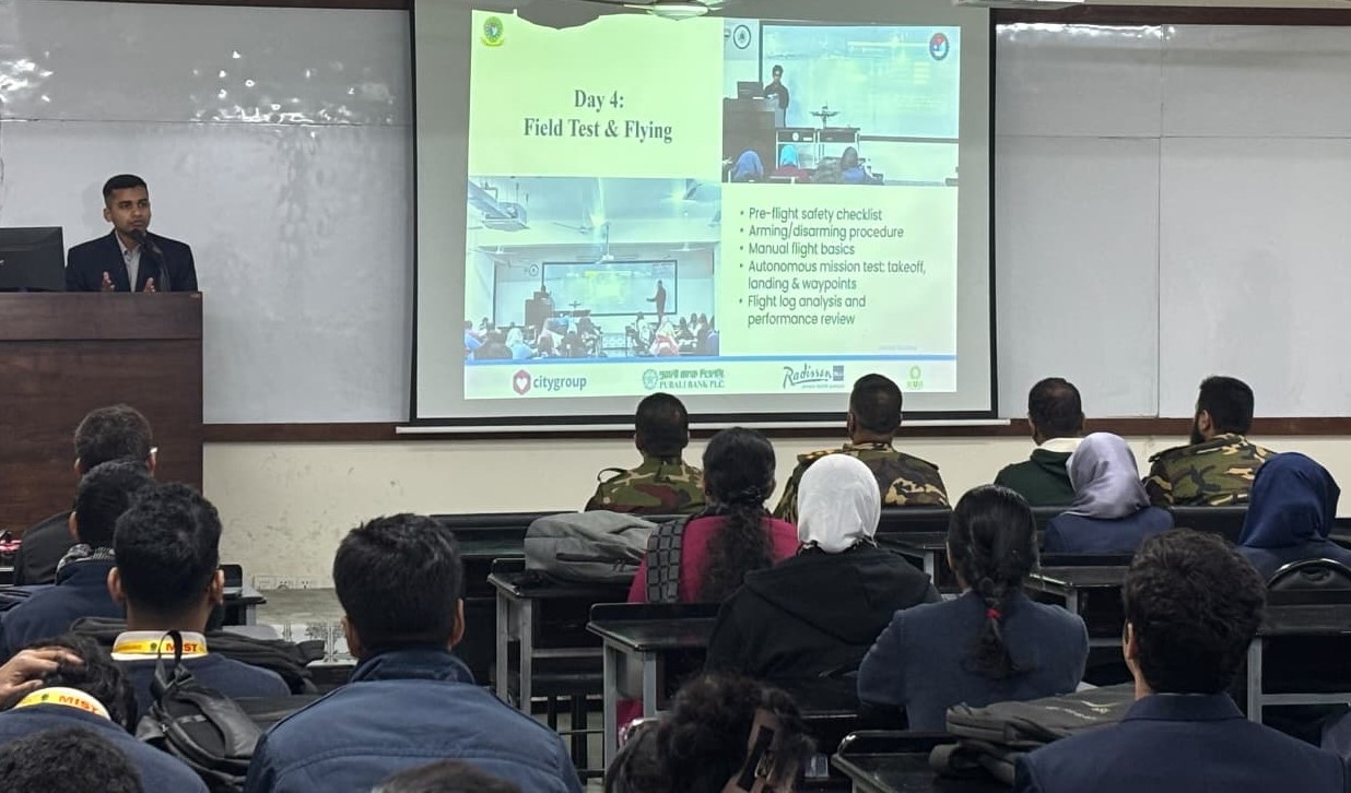 MIST Mavirov, a student-led research team under the supervision of the EECE Department, successfully concluded the "Introduction to Aerial Drone Building and Autonomous Flight” course, with a closing ceremony held today. A total of 63 students from various departments of MIST participated in this 4-day, hands-on and theory-based course, gaining practical experience in aerial drone construction and autonomous flight systems. The course culminated in a field test on the final day, where participants applied their knowledge through real-time flight operations.